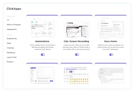 ClickUp offers customizable automations to optimize efficiency and streamline processes, automating task assignments, status changes, notifications, and setting up recurring tasks and reminders.
